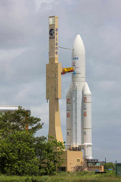 Slika 2: Raketa Ariane 5 Evropske vesoljske agencije ESA pripravljena na izstrelitev. Vir: Wikipedia.