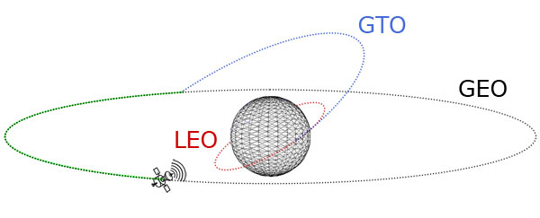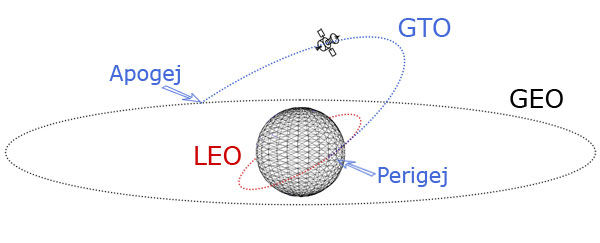 prehodno geostacionarno orbito (ang. Geostationary Transfer Orbit - GTO). GTO je eliptična orbita, ki povezuje LEO in GEO orbito. Perigej (točko eliptične tirnice, ki je najbliže Zemlji) ima na LEO, apogej (točko eliptične tirnice, ki je najbolj oddaljena od Zemlje) pa na GEO orbiti.