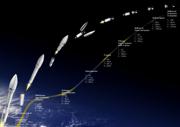 Slika 1: Prikaz odpadanja posameznih nivojev rakete Vega med poletom v vesolje. Vir: CNES.