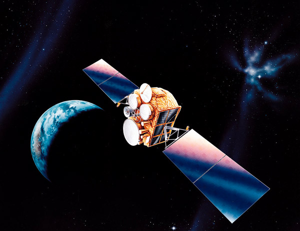 Satelit z oddajno anteno na Zemljo pošilja