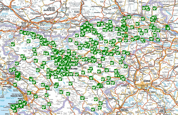 Zemljevid vseh AED v Sloveniji. Dostopen je na spletni strani AED baze Slovenije.